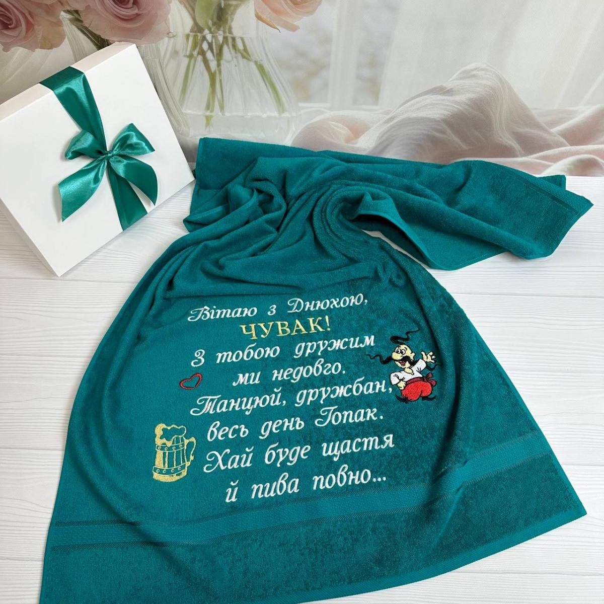 Махровий рушник зі 100% бавовни з якісною машинною вишивкою. М'який, добре вбирає вологу та приємний до тіла. Оригінальний жартівливий дизайн робить його чудовим подарунком на день народження, для друга, брата чи колеги. Ідеально підходить для бані, сауни або домашнього використання.