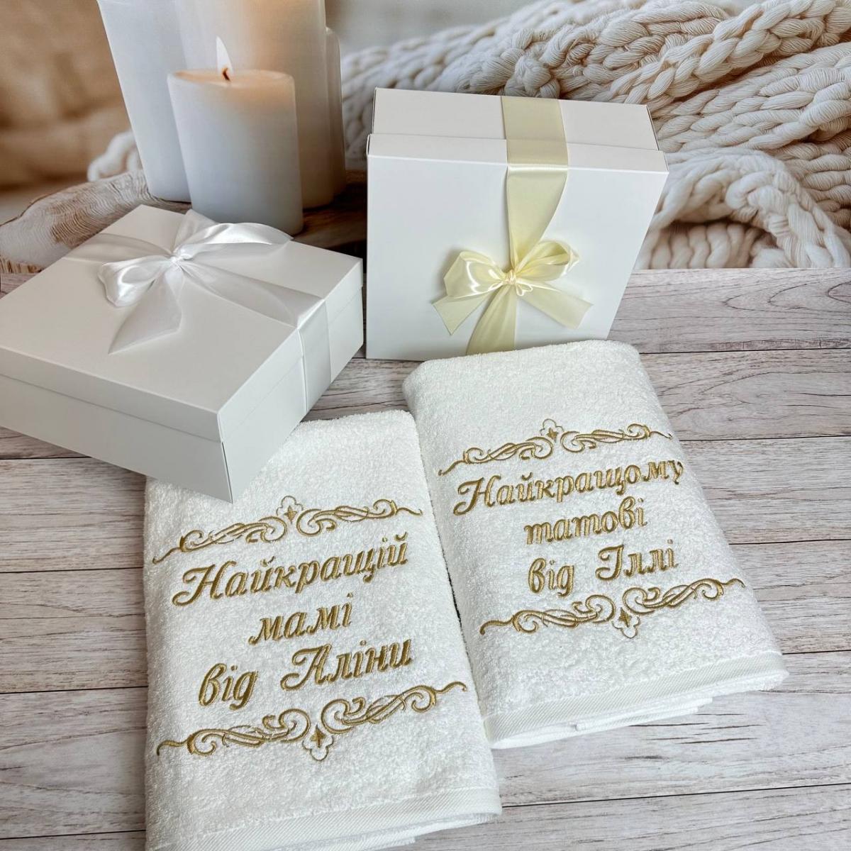 Махровий рушник із вишивкою - ідеальний подарунок для батьків! Оберіть білий, чорний або інший колір за вашим смаком. Вибір кольору та надпису залишається на вашому розсуді. Упакований у стильну подарункову упаковку, цей махровий рушник стане чудовим сюрпризом на будь-яке свято. Його вишуканість та комфорт неодмінно припадуть до душі вашим батькам.